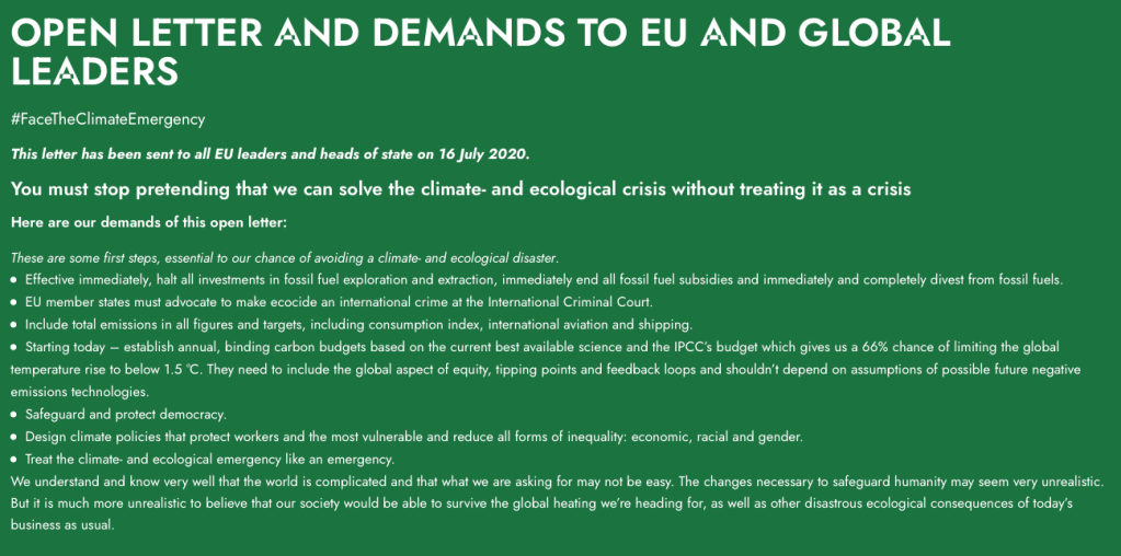 On 16th July an open letter was sent by Greta Thunberg and others to EU leaders, saying that it is time to Face the Climate Emergency. You can see the letter and sign it yourself here: https://climateemergencyeu.org