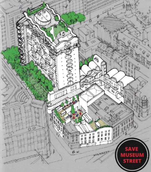Save Museum Street has developed an alternative scheme which preserves the existing concrete frame, saving thousands of tonnes of carbon dioxide from being emitted into the atmosphere (see image below). We encourage people to email Camden Council’s planning department on planning@camden.gov.uk and object to the planning application, ref. 2023/2510/P.
