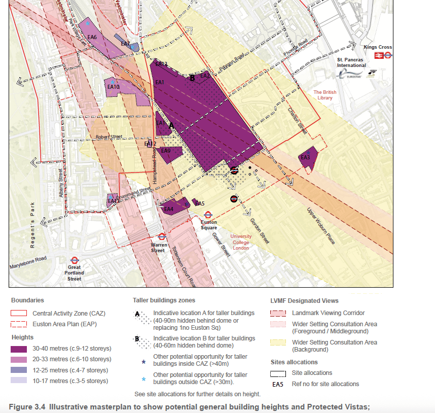 above: extract from the Euston Area Plan. 250 Euston Road is marked ‘EA4’ and the key says that a 30-40m high building is anticipated, along with a taller building (up to 75m as stated in the text above).