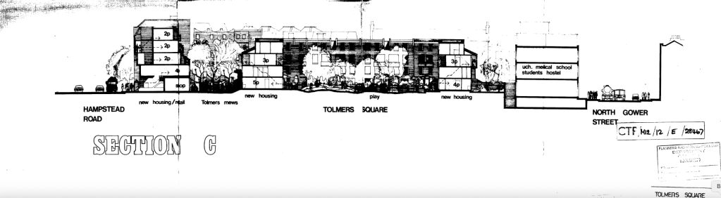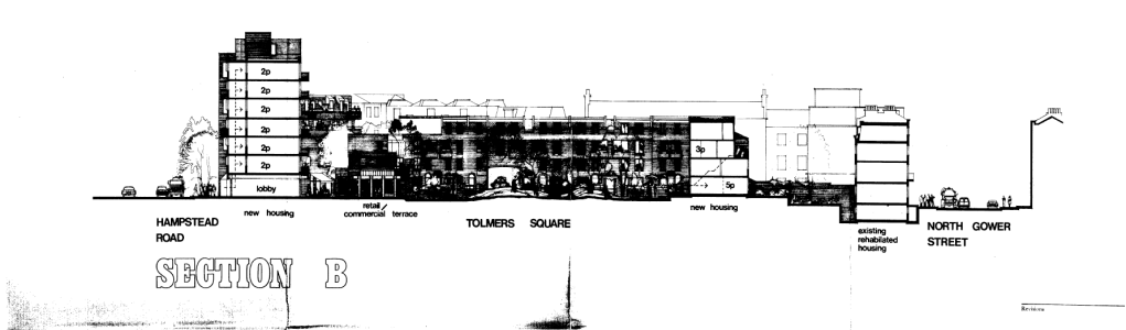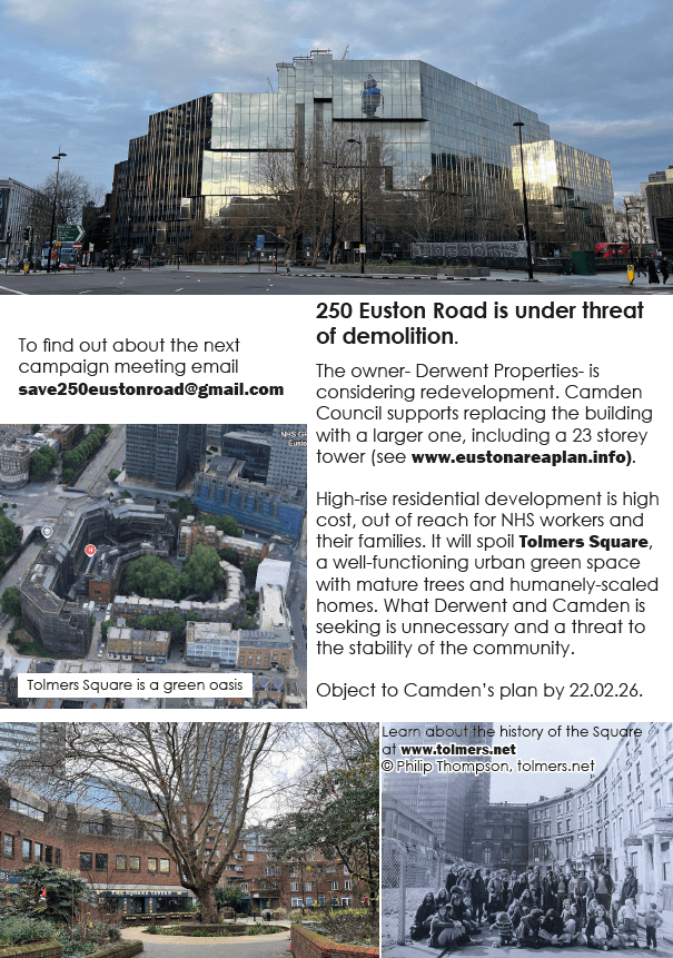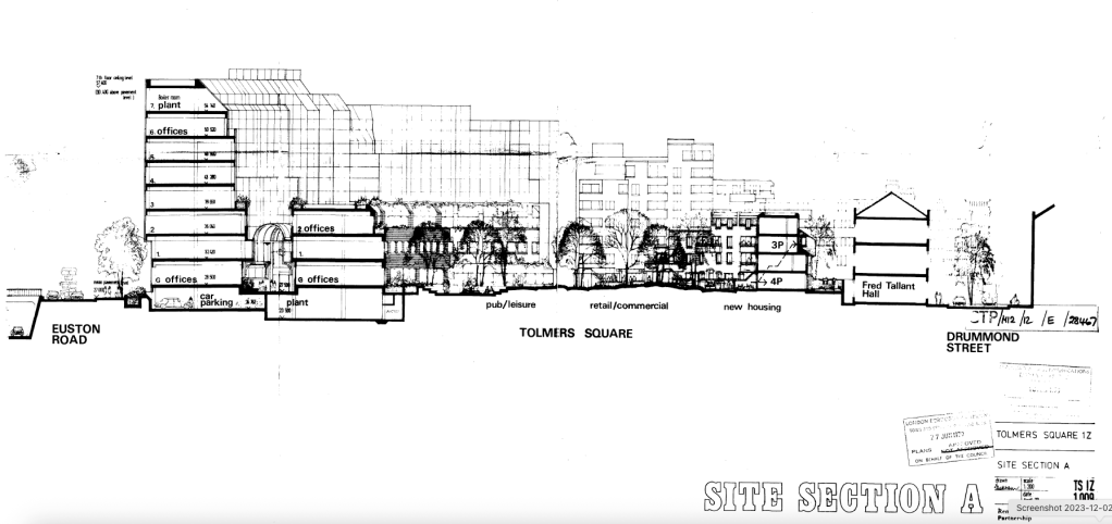 This would have devastating impact on the residential square that lies behind the office building, Tolmers Square. The whole ensemble was designed by Renton Howard Wood Levin as a carefully considered whole.